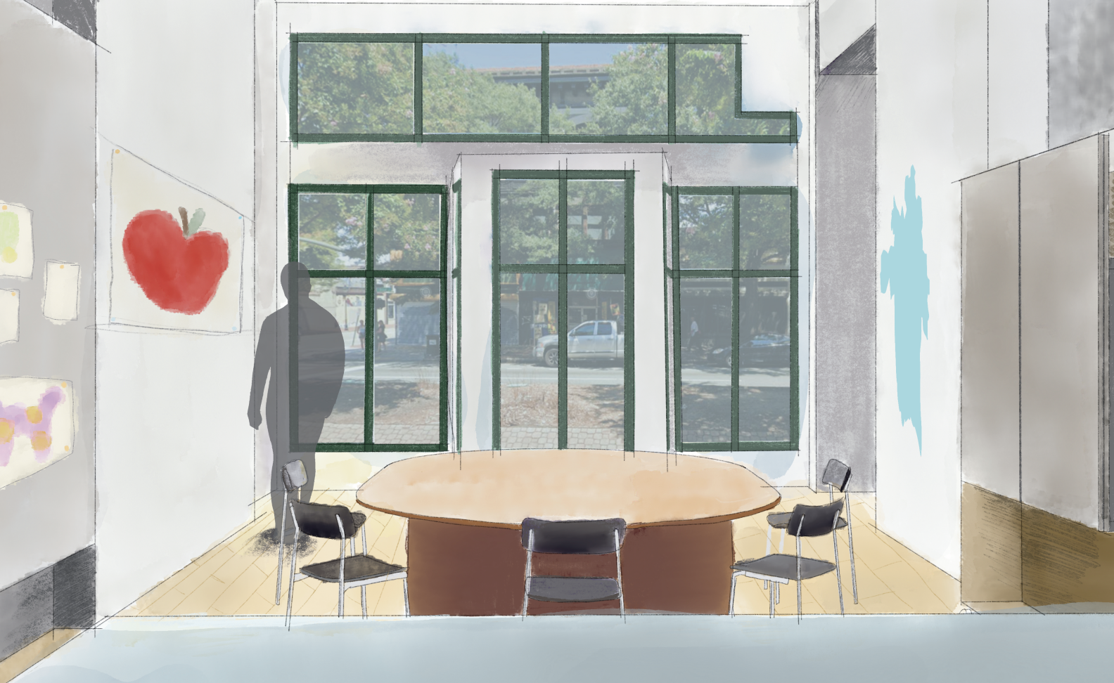 The second significant alteration was removing the door on the business side. In spotlighting a single door, SFCD will have more room to expand its office space, move its waiting area per request, and grow into the shared studio space while working with mOb students and community members.
