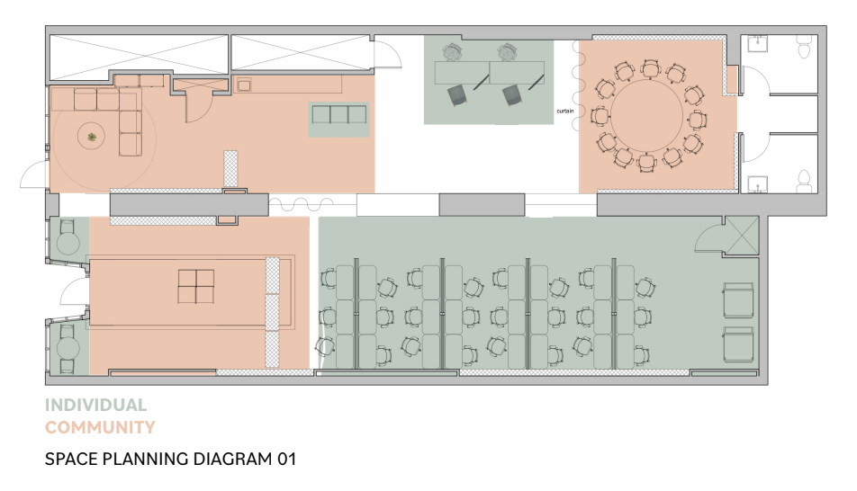 The way people think about where they work is changing. With the start of the pandemic and the new emphasis on designing a ‘contactless’ community, we wanted our design to celebrate the relational themes between Storefront and the mOb studio to rebuild the community between both organizations.
